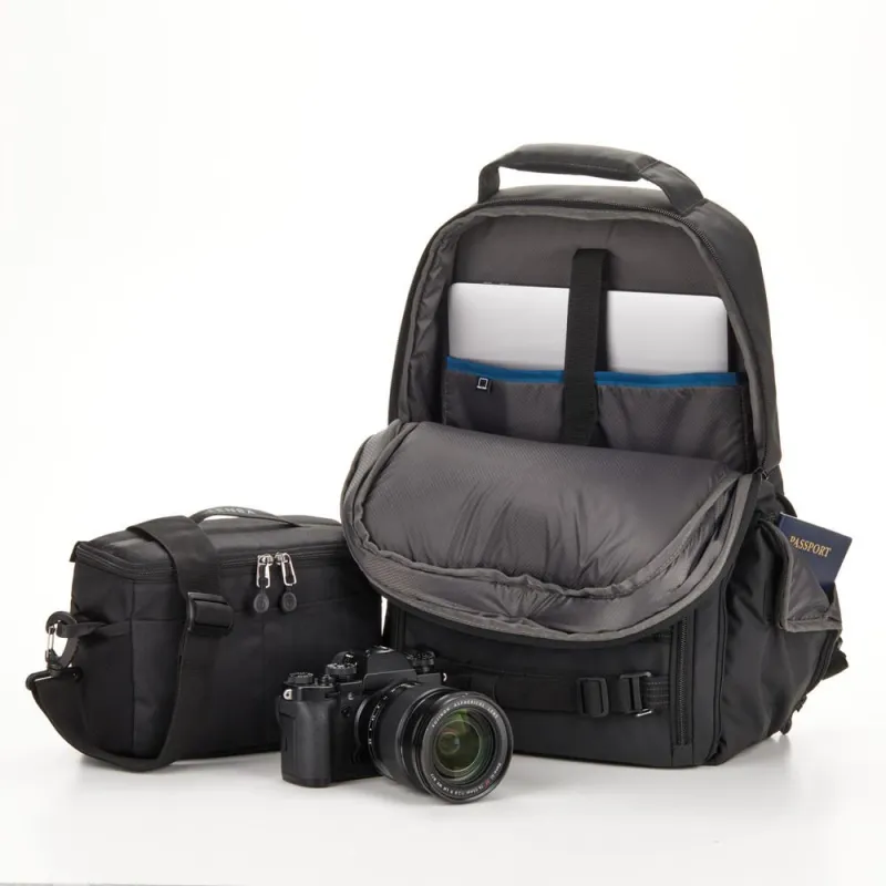 Holds Multiple Cameras and AccessoriesPadded Laptop/Tablet StorageHidden Pocket for Wireless Tracking TileTop, Side, and Rear Camera AccessTwin Sternum StrapsMOLLE-Compatible Loops on ExteriorTrolley Strap Secures Bag to LuggageWater Repellant CoatingPocket for Water Bottle or TripodReversible Rain Cover