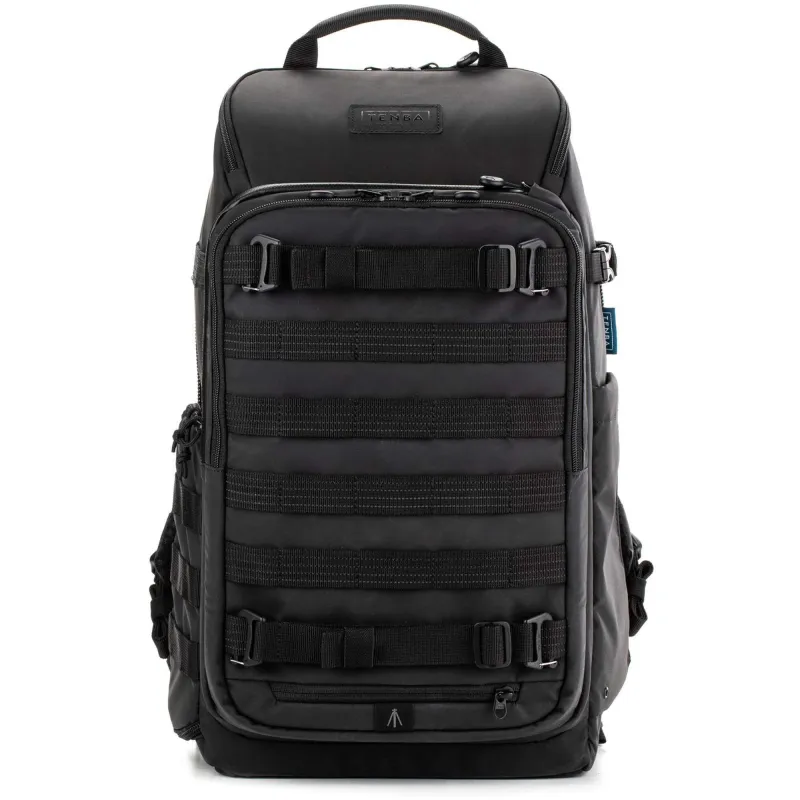 The updated black, 20L Axis V2 Backpack from Tenba is built for the working professional, content creator, photographer, or filmmaker. The pack holds two mirrorless or DSLR cameras, seven 2.8mm lenses, a 14" laptop and a compact drone. This backpack is the first to include a hidden neoprene pocket that holds an Apple AirTag or Tile Bluetooth Tracker. The MOLLE webbing all around the exterior of the pack allows you to add additional Tenba accessories, including lens capsules, battery pouches, and card wallets. Tenba's exclusive Airflow harness and auto-adjusting Pivot-Fit straps mean the pack will fit, no matter what shape or size you are. The bag has unique dual sternum straps to ensure superior load-balancing across the chest, and allowing female users to position the straps above or below the bust for superior comfort. One of the sternum straps can be removed, if desired. A reversible rain cover is included, one side is black and the other silver to reflect UV rays.