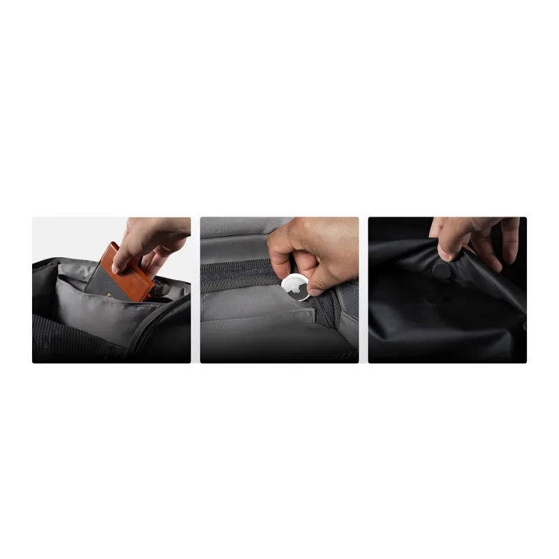- Vidinės kišenės atminties kortelėms, filtrams, AirTags ir mažiems daiktams