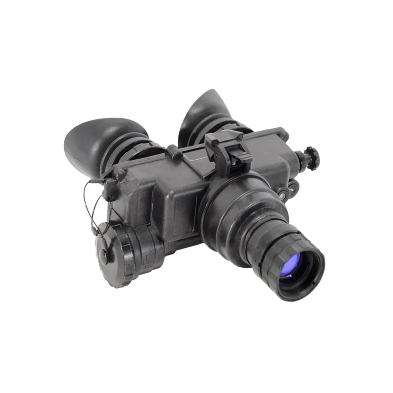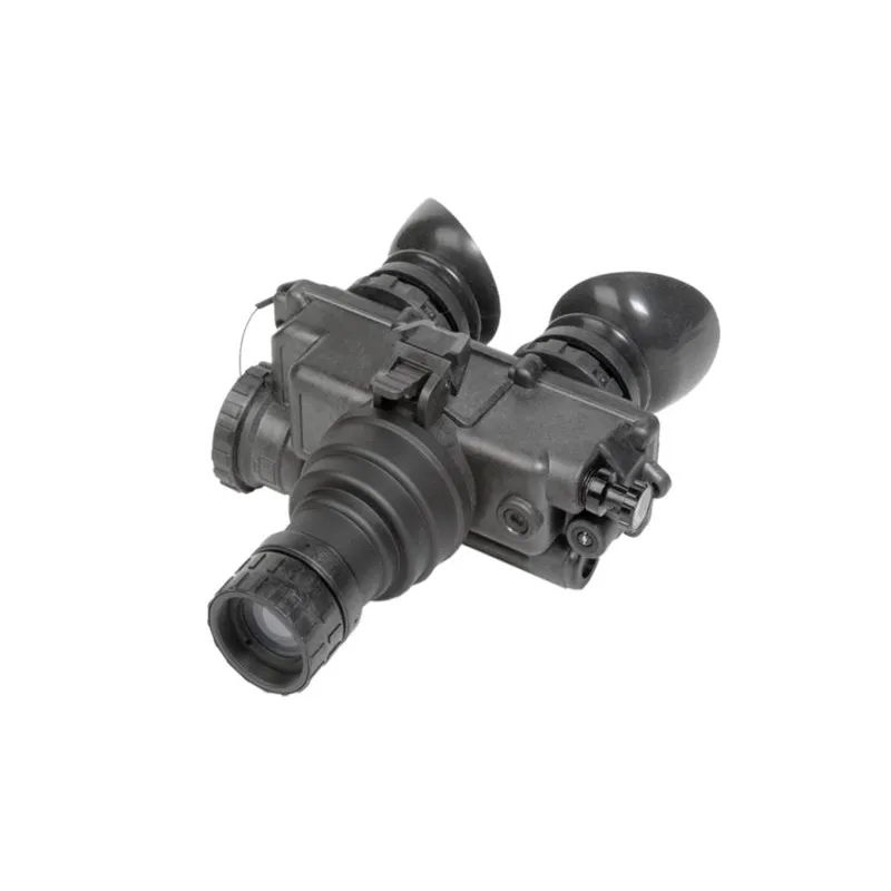 The AGM PVS-7 NW1 is a high-end night vision bi-ocular with a goggle system for hands-free use. It features an IIT image tube in night vision white and has a 27mm lens with a wide field of view of 40 degrees. The device offers 1x optical magnification, with optional afocal magnifier lenses available.