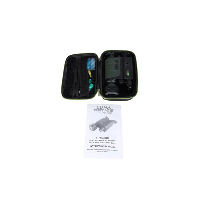 The Luna Optics STARGAZER is a binocular day and night scope with a 50mm lens, 6x optical magnification, and up to 39x digital zoom. It features a state-of-the-art AMOLED-Q Quad-Pixel HD display, a 16.1-megapixel photorecorder, and a viewing distance of up to 600m in complete darkness.