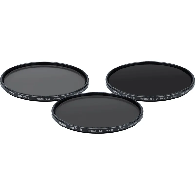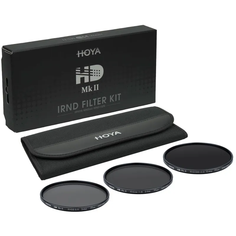 The HOYA HD Mk II IRND FILTER KIT includes the three premium IRND filters HD Mk II IRND 8, 64 and 1000. As these densities allow photographers to create all possible effects of ND filters, such as motion blur, flowing effect and greater creative control over exposure, it is the perfect all-around kit that contains all essential and most popular ND filters for photography.