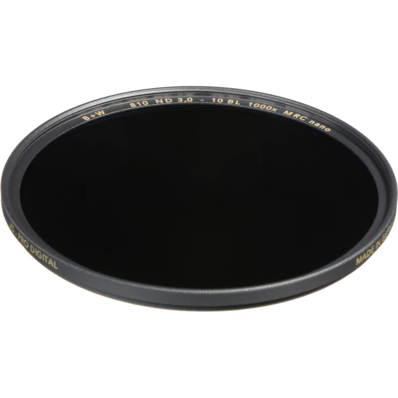 The B+W 52mm XS-Pro MRC-Nano 810 ND 3.0 Filter (10-Stop) is a neutral density filter with a 1000x filter factor that provides a 10-stop exposure reduction. Its 3.0 density creates a darkening of the entire image, allowing you to photograph with a wider aperture or slower shutter speed than normally required. By increasing your aperture or slowing your exposure time, you can control depth of field and convey movement more easily. Neutral density filters do not affect the coloration of the image and are ideal for pairing with other filters.