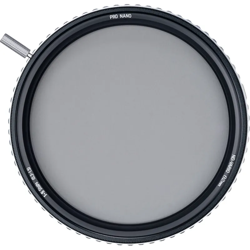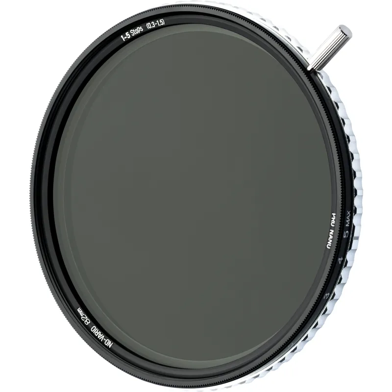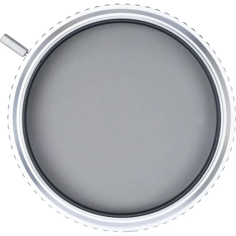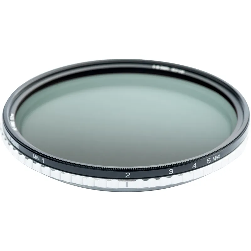 The NISI ND-VARIO Filter is a variable neutral density filter that reduces exposure by 1 to 5 EV. The ND factor is easily adjustable by rotating the front filter ring, which features a silver lever for added convenience. Built-in stops at the end positions help users gauge their settings during use.