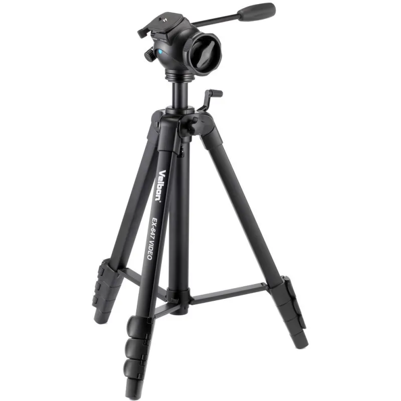 The Velbon EX-647 Video is a 68 inch video tripod with Fluid Head. The tripod has 4-section legs with flip lever leg locks, radial leg braces, and rubber feet. The legs also have radial leg braces for added stability. The center column is a geared and a level bubble is included on the tripod. The fluid head is detachable. The fluid head has a quick release plate (QB-46).