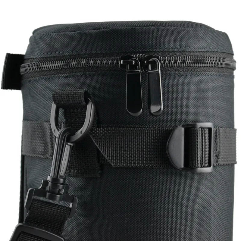 JC Deluxe Lens Pouch is designed to carry a typical SLR lens. This pouch features heavy-duty polyester construction with a soft interior. It provides great protection and shock absorption for your lens. The pouch can be carried by a double touch belt loop, two webbed eyelet loops or two D-rings for an optional shoulder strap. This series lens pouch is available in 7 sizes to fit a wide variety of lenses. It has a double-zippered lid with an inside mesh accessory pocket. The two zipper sliders are designed with small loops, thus you can lock them together with a small lock for more safety. Its exterior material is water-resistant, so it protects your lens from moisture effectively.