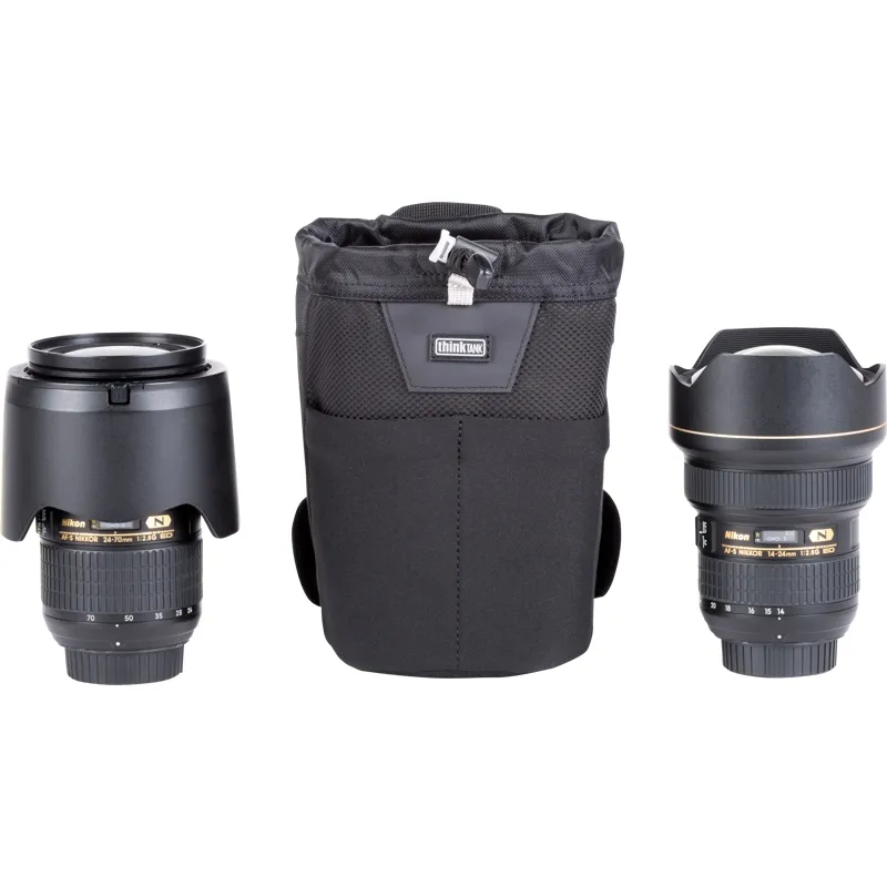 Modular pouch holds a 24–70mm f/2.8 lens with lens hood in shooting position, or other similar size lenses
