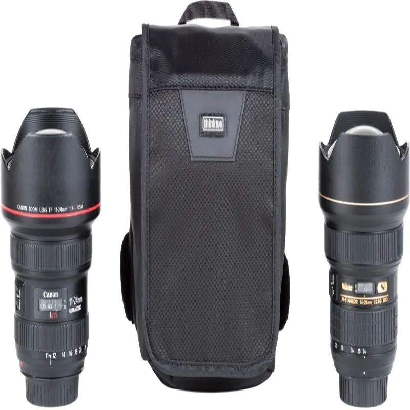 Lightweight compressible modular pouch holds wide-angle lenses with the hood attached and in the shooting position.