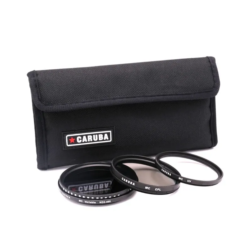 With the Caruba UV + CPL + Variable ND2-400 Kit you have a complete set with three different filters. In the kit you will find a UV filter, a circular polarization filter and a variable ND filter that can be set from two to 400, giving you access to one to nearly nine stops. All three filters have a twelve-layer coating and the inner ring of the filters is finished in matte black to prevent glare and reflections.