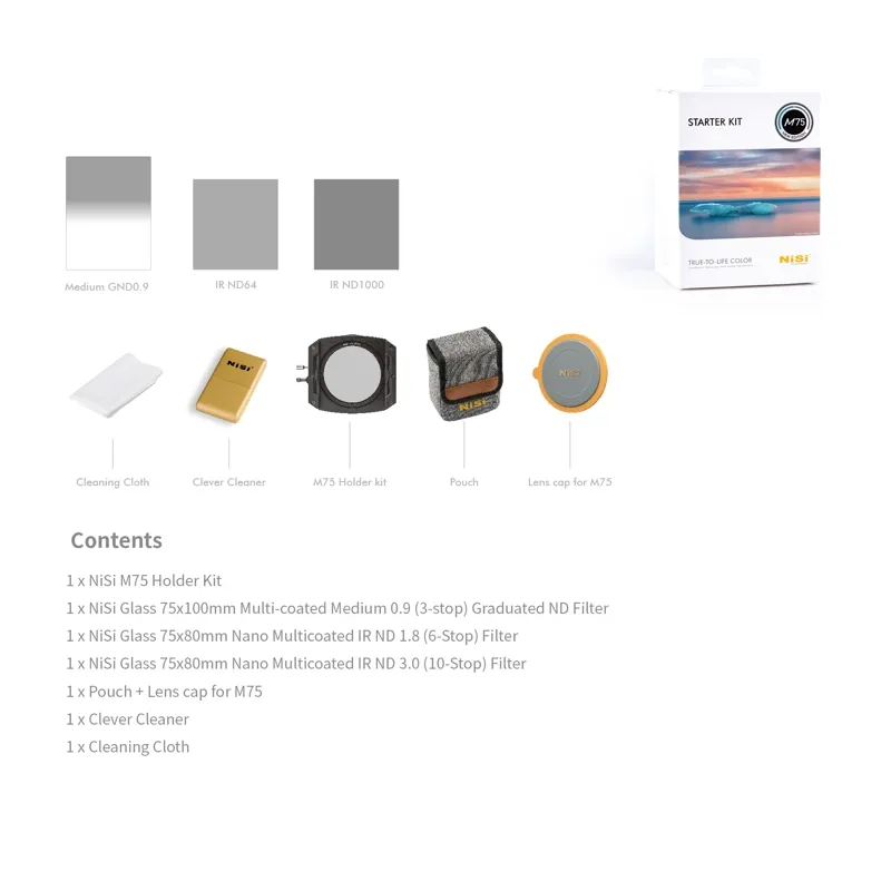 NiSi M75 Starter Kit 75mm System is made especially for mirrorless cameras and compacts and is compatible with 75mm wide square filters (2 mm thick) from NiSi and other brands.