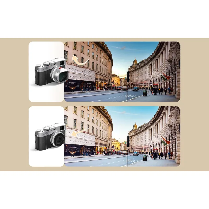 Freewell Saulės skydas Fuji X100 serijai suteikia objektyvo apsaugą ir integruotą CPL/Juodo rūko filtrą (49mm). Poliarizuojantis filtras sumažina atspindžius ir pagerina spalvų sodrumą, kas puikiai tinka peizažų fotografijai ir kitiems naudojimams. Juodo rūko efektas suminkština šviesą ir yra idealus portretams bei miesto nuotraukoms.