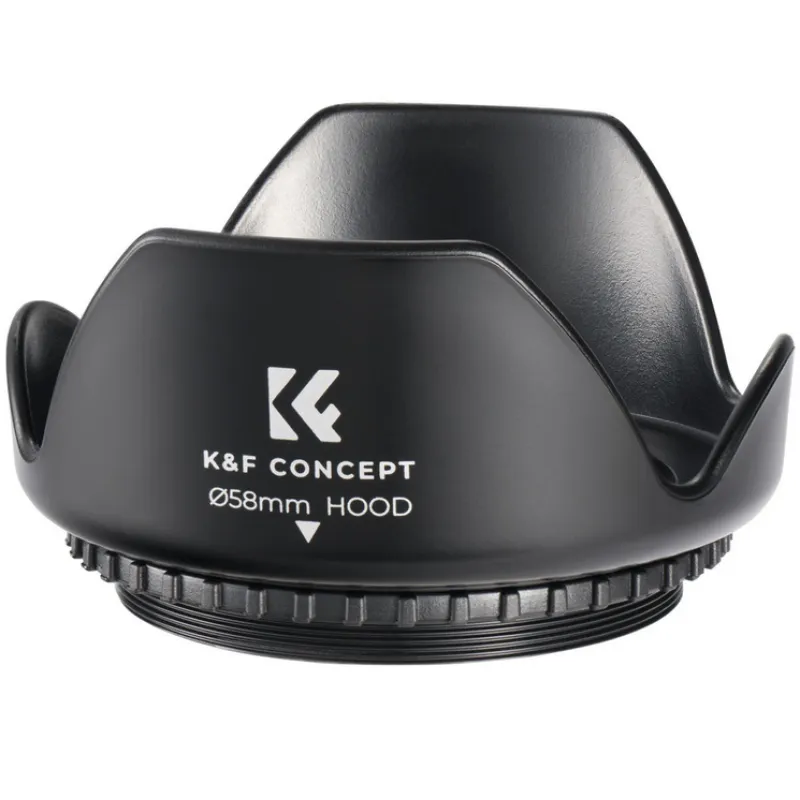 The K&F 58MM Camera Lens Hood is designed to enhance your photography by preventing unwanted light interference, improving image quality during backlight, sidelight, or flash photography. Made from high-quality composite material, this hood offers robust protection for your lens, being anti-fall, bump-proof, and wear-resistant. It is precisely manufactured to fit lens screw specifications, ensuring no light leakage or vignetting and a secure fit without noise or looseness. The package also includes a vacuum-packed microfiber cleaning cloth to keep your lens and filters clean without leaving dust or causing damage.