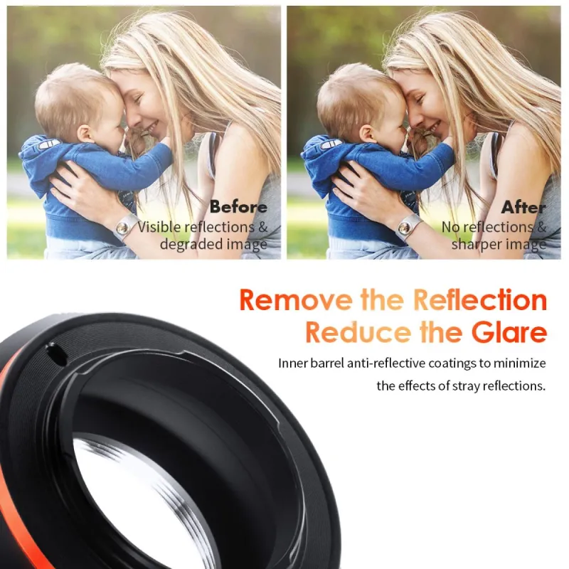 - * High-precision perfect transfer, aluminum-magnesium alloy ring body, fine copper bayonet will not wear the lens, the workmanship is very exquisite, tightly and smoothly combined with the bayonet, receive focus, play the lens macro function, and can be infinitely closed focal.