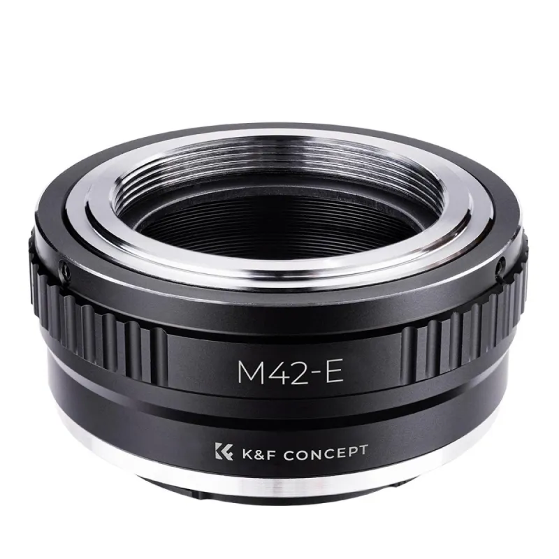 This adapter allows M42 mount lenses to be used on Sony E NEX/Alpha camera bodies. Constructed from brass and aluminum, it offers a stable, precise, and durable design. The adapter is manually operated and supports infinity focus.
