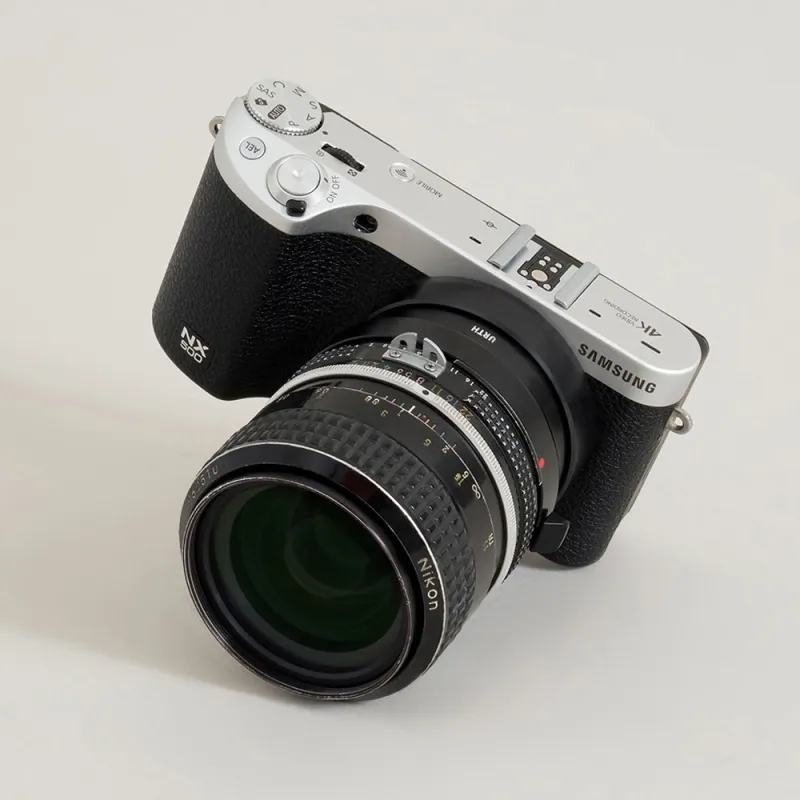 Combine a Nikon F mount lens with a Samsung NX mount camera body.