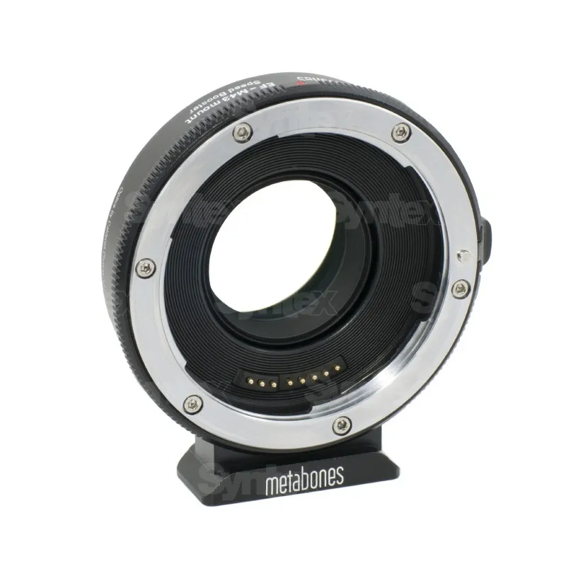 Canon EF to Micro-4/3 mount Speed Booster adapter makes lens 0.71x wider, increase maximum aperture by 1 stop, and increases MTF. The adapter features built-in electronics to control lens aperture by the controls on the camera body, and is also powered by the camera's body. The adapter is an ideal companion for Blackmagic Cinema Camera MFT or the mirrorless Panasonic GH4 models.