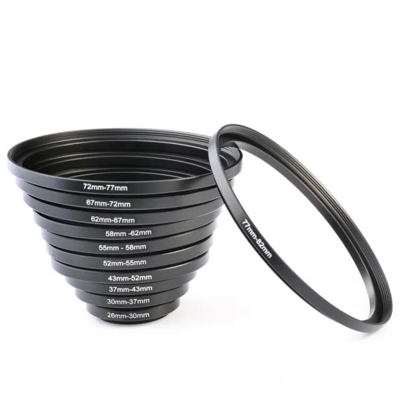 - * Kit Includes: Generic Metal 11pcs Step Up Ring 26-30MM,30-37MM,37-43MM,43-52MM,52-55MM,55-58MM,58-62MM,62-67MM,67-72MM,72-77MM,77-82MM