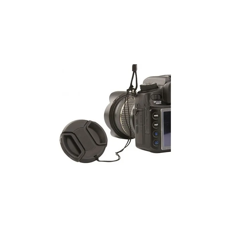 This lens cap snaps on over the lens of the camera and has a retaining string so the cap hangs with the camera when shooting. This helps to prevent loss of the lens cap. Lens caps protect the camera's lens from scratches, fingerprints and the elements when the camera is not in use.