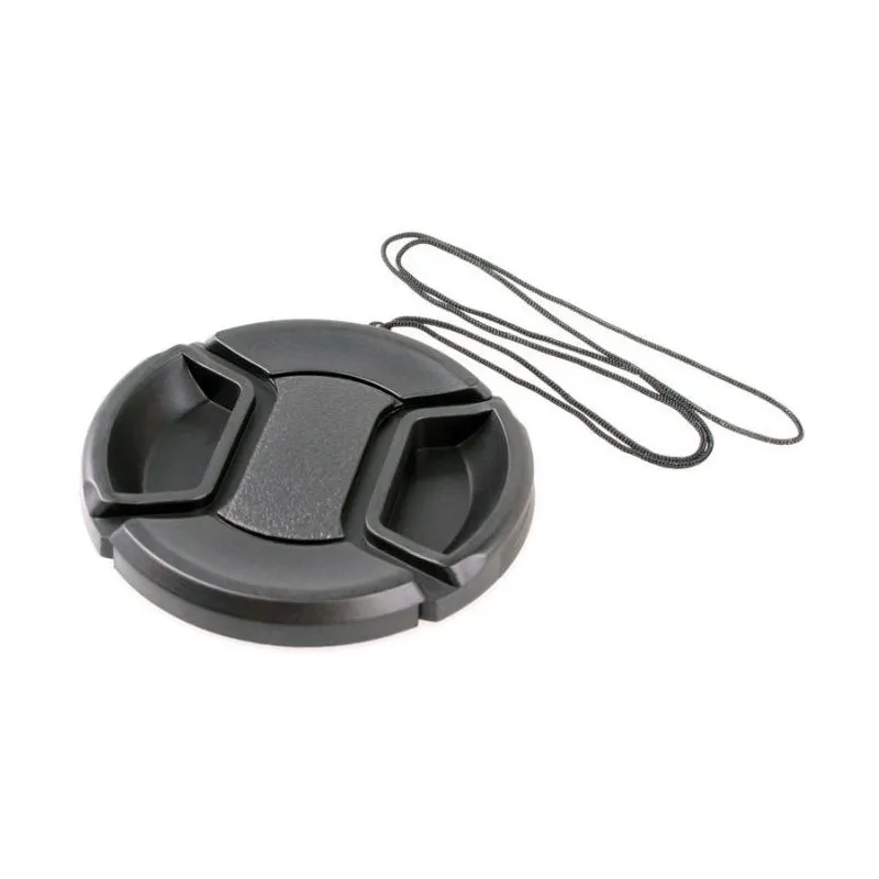 Lens caps protect the camera's lens from scratches, fingerprints, and the elements when the camera is not in use. This lens cap snaps on over the lens of the camera and has a leash so the cap hangs with the camera or camera strap when shooting, ensuring the cap won't get lost.