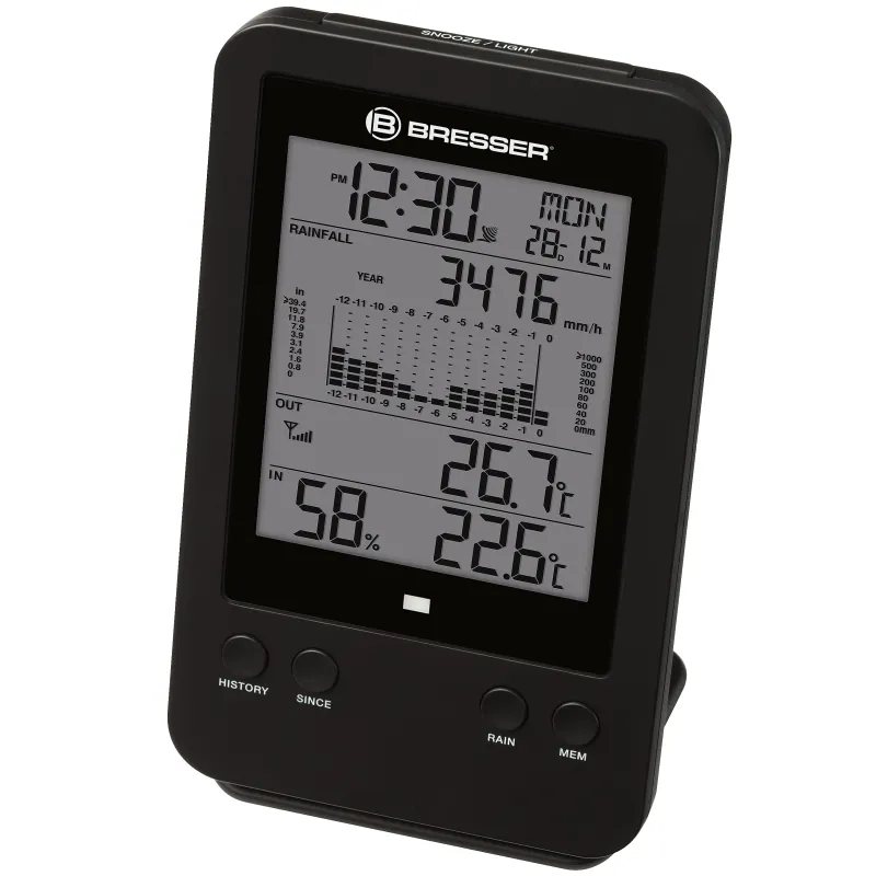 The BRESSER Professional rain gauge shows the detailed rain measurement values in millimetres , but also the indoor and outdoor temperature is displayed precisely. The rain gauge has a radio distance of 150m outdoors . The radio range is achieved by the 868 Megahertz radio signal . The base station can determine temperature and humidity and can also show the rain readings hourly , daily , weekly , monthly or annualy . It is equipped with a graphical histogram .