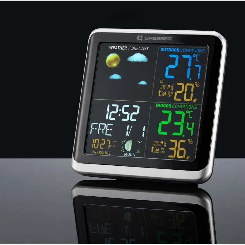 This BRESSER Weather Station ClimaTemp TB has a clearly arranged colour display , which is divided into 4 areas.