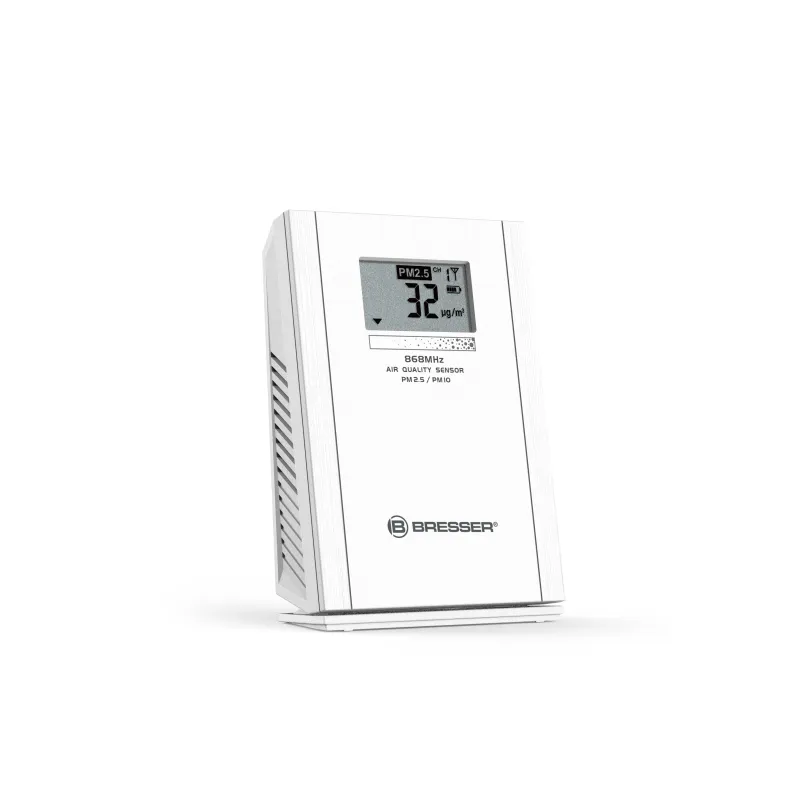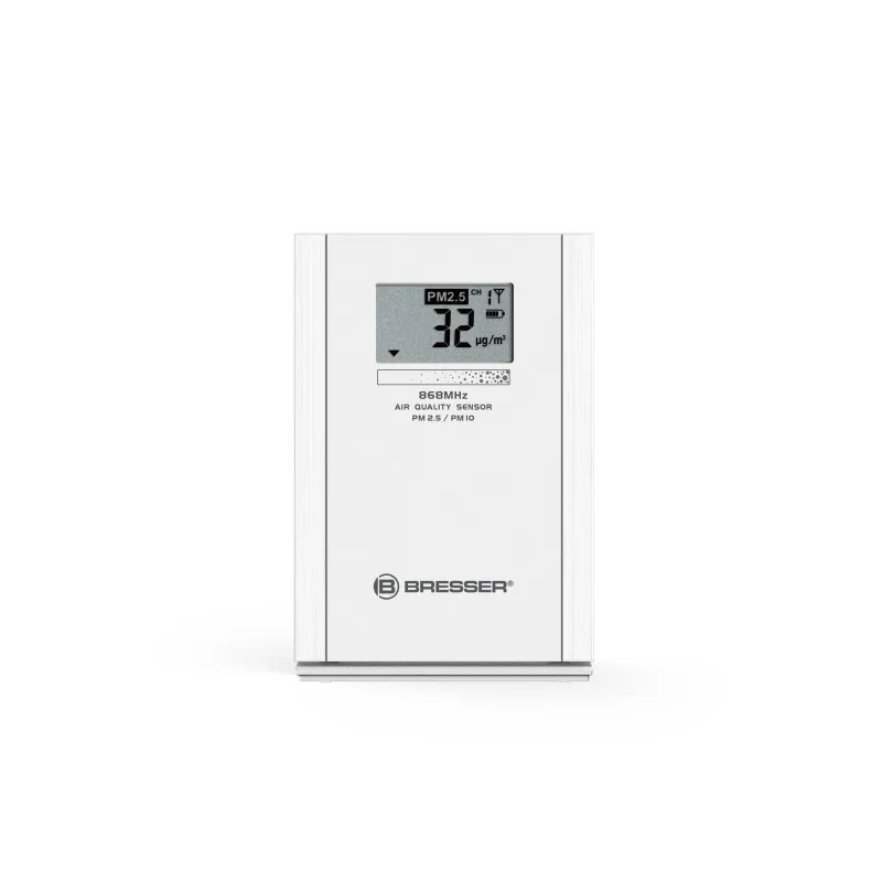 A useful extension to your BRESSER weather station, or also ideal as a practical standalone solution: This PM2.5/PM10 particulate meter will help you to keep track of the air that you breathe. The high-precision meter reliably detects two types of health-relevant particulate matter that causes air pollution: particles with a diameter of less than 10 μm (PM10) and less than 2.5 μm (PM2.5) . Measurements – the current reading and the average particulate concentration from the past 24 hours – are displayed on the built-in display and on your weather centre. The base station can be placed at a distance of up to 150 metres from the meter.