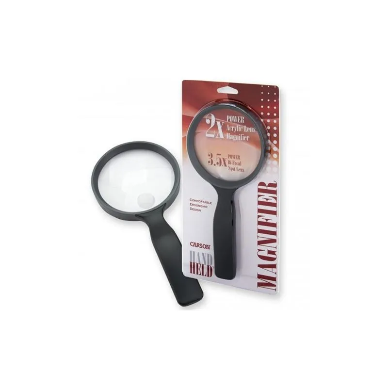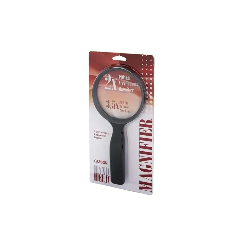The Carson Handheld Magnifier 2x110mm is a handheld magnifier, equipped with an ergonomic plastic handle and power spot lens.