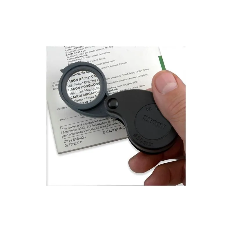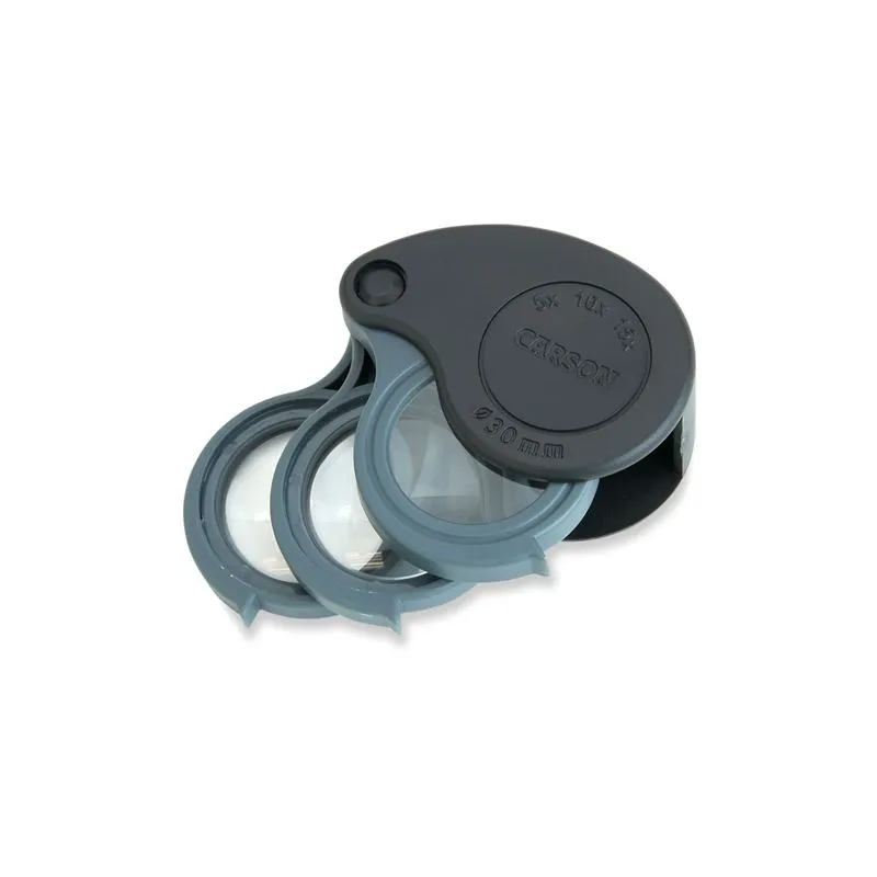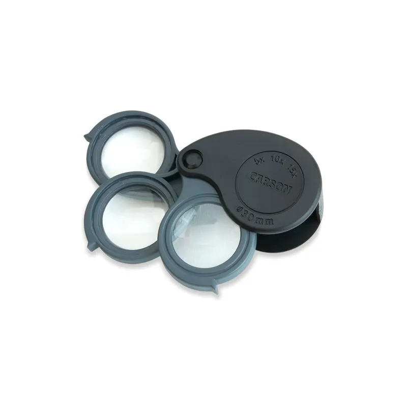 The Carson TV-15 is a universal, compact impact magnifier that features multiple magnifications (5x, 10x and 15x). The magnifier has three separate magnifying lenses, with each lens having 5x magnification. So by folding out the lenses you can magnify 5x, 10x and 15x.