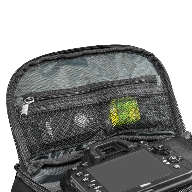 In addition to the main compartment, a zip pocket on the front and a mesh pocket on the top provide room for additional camera accessories such as filters and SD cards. On the sides, you ll find two additional storage compartments, one of which has a net, which is perfect for drinking bottles, for example. The mantona Milano grande camera bag is closed with two innovative magnetic fasteners.