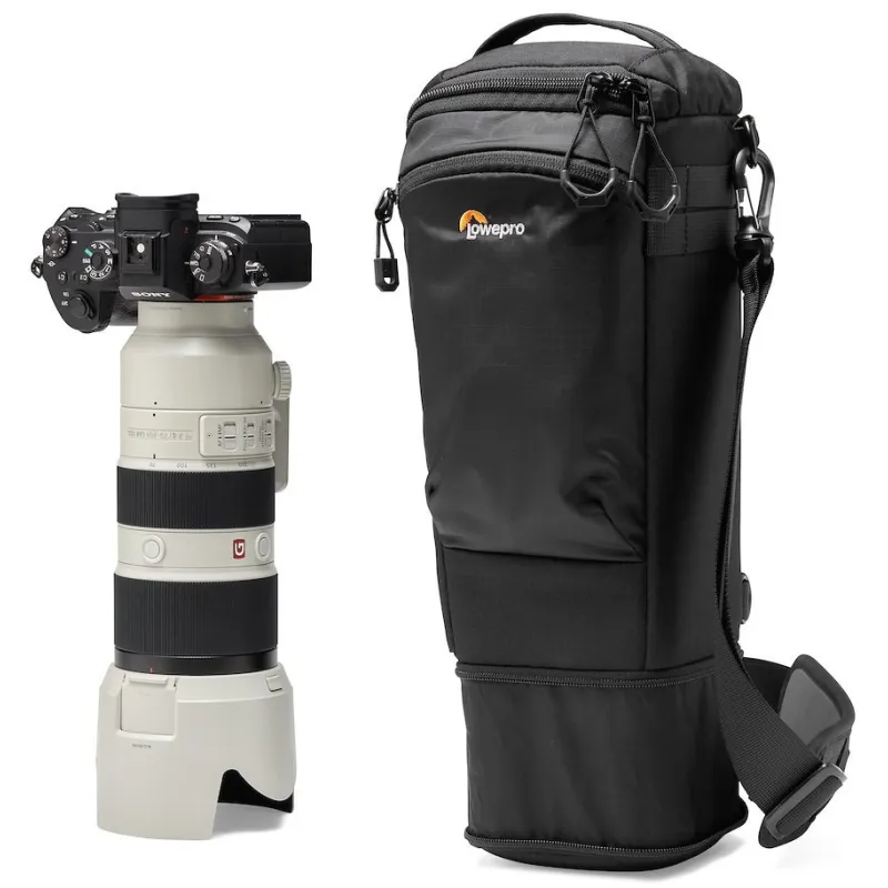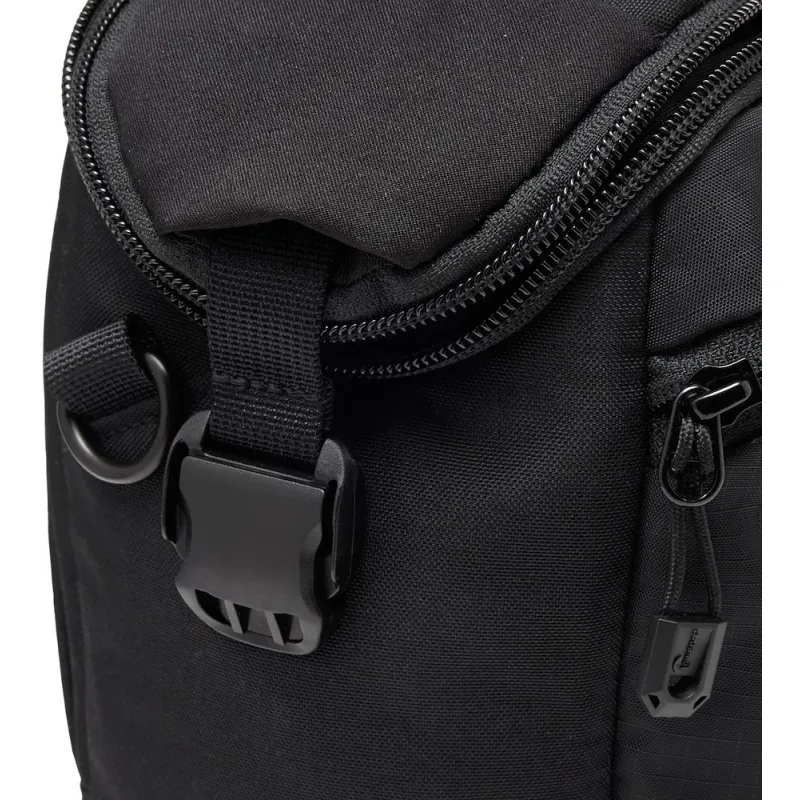 This toploader is perfect for outdoor events, featuring an expansion section for lens hoods and a side-opening door for easy access. The quick-close buckle ensures fast retrieval, while the interior divider allows for organized storage of a camera and an additional lens.