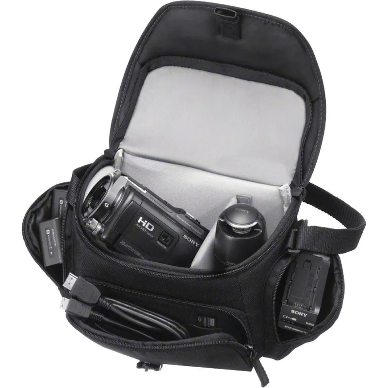 The black LCS-U21 Soft Carrying Case from Sony is a medium-sized case to hold your HD camcorder, Alpha DSLR, NEX or Cyber-shot camera. The case features a movable interior divider that will help you configure your gear to suit your need. Three exterior pouches-two on the side and one in front are provided for storage. The front pocket has a built-in Memory Stick holder.