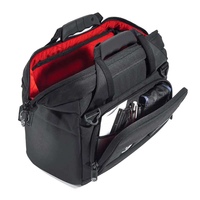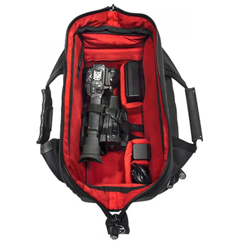 Compact video camera shoulder bag with innovative design featuring extra wide opening to hold your camera with accessories attached.