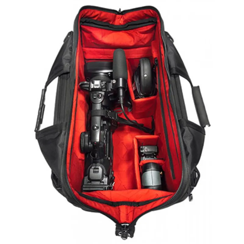 Large video camera shoulder bag with innovative design featuring safe shell and extra wide opening to hold your camera with accessories attached and extra gear.