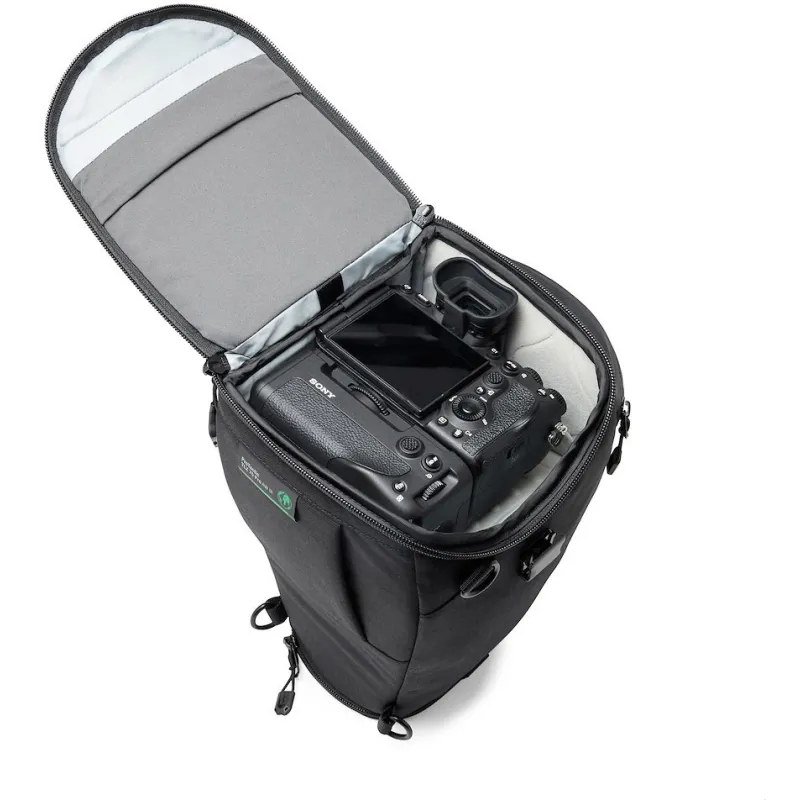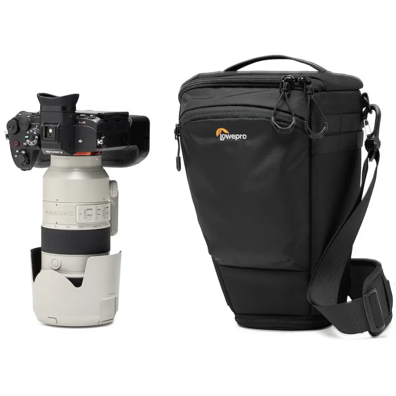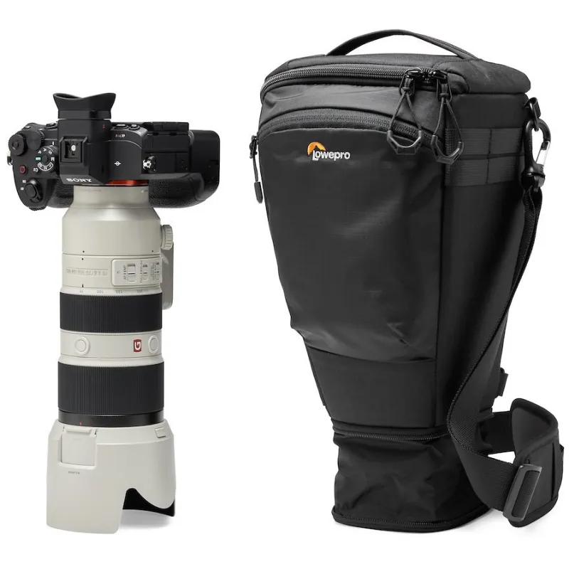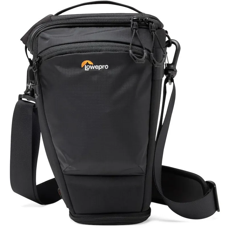 This toploader is perfect for outdoor events, featuring a side-opening door for easy access and a quick-close buckle for security. The interior divider allows for easy camera removal or a two-lens setup.