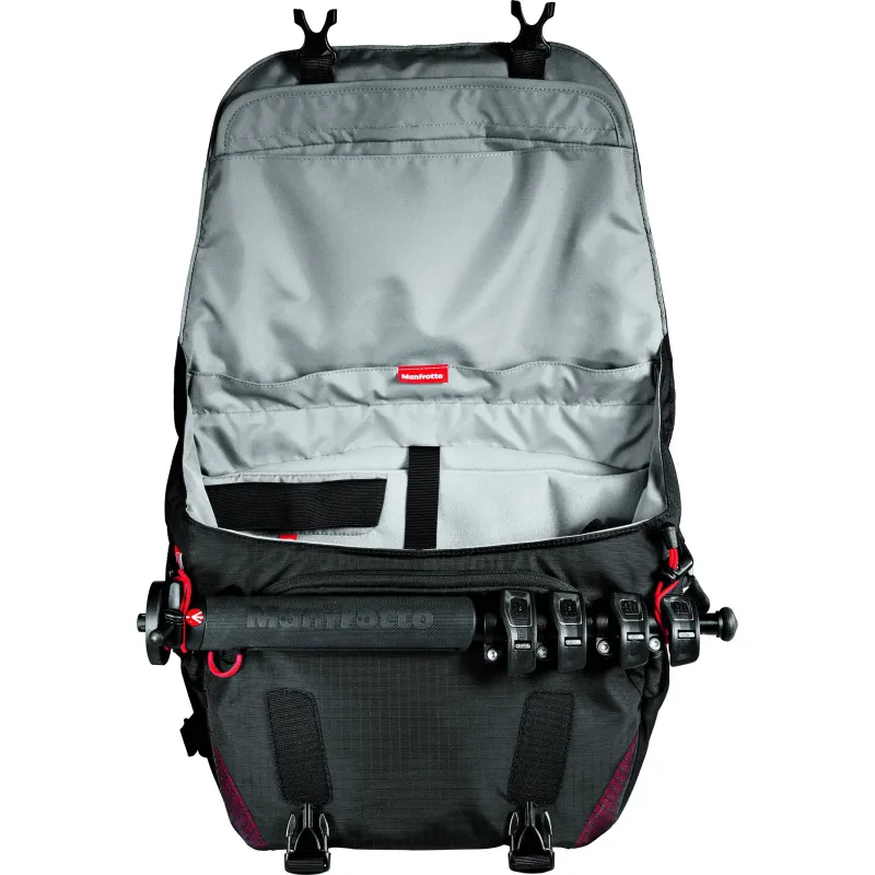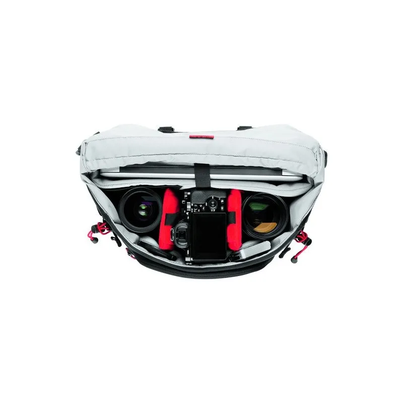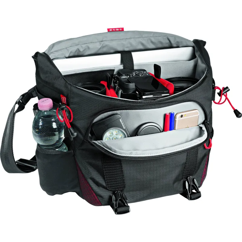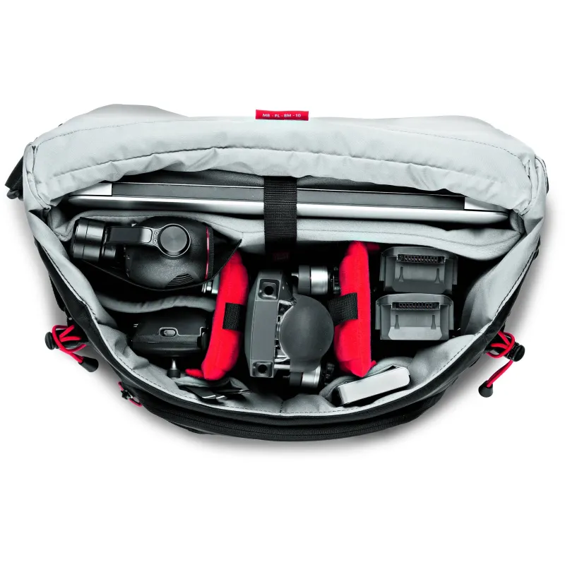 The Manfrotto Bumblebee M-10 PL camera messenger is a professional camera messenger bag designed for outdoor shooters who are always on the move. This super-roomy, slim profile bag is built to keep a professional camera kit plus a 13” laptop protected while providing long-wearing comfort. Its signature design Camera Protection System dividers safeguard a CSC/DSLR body with 24-70/2.8 lens attached plus 2 lenses (including 70-200/2.8), a handheld gimbal and lots of accessories. These can be taken out quickly through the top zip opening. The specially designed XtraSecure strap keeps the moving part of the handheld gimbal steady. The bag also holds a gripped DSLR kit when no laptop is packed.