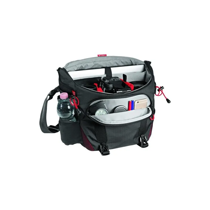 The messenger opens via the Velcro fastening or buckles. Apply the NoiseFree Velcro silencer for extra discreet use. The elastic NeverLose tripod connection is always ready to secure a mini tripod, monopod or camera pole. There are numerous external zip or stretchable pockets for accessories and a water bottle. This model comes with a DuoFace sun/rain cover, which provides extra protection in rough weather and reflects sunlight, keep gear cool and dry all day long. Carry it on your shoulder, cross-body or using the grab handle, which can also be inserted onto a roller handle for easy travel.