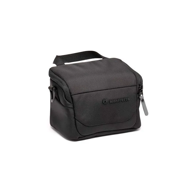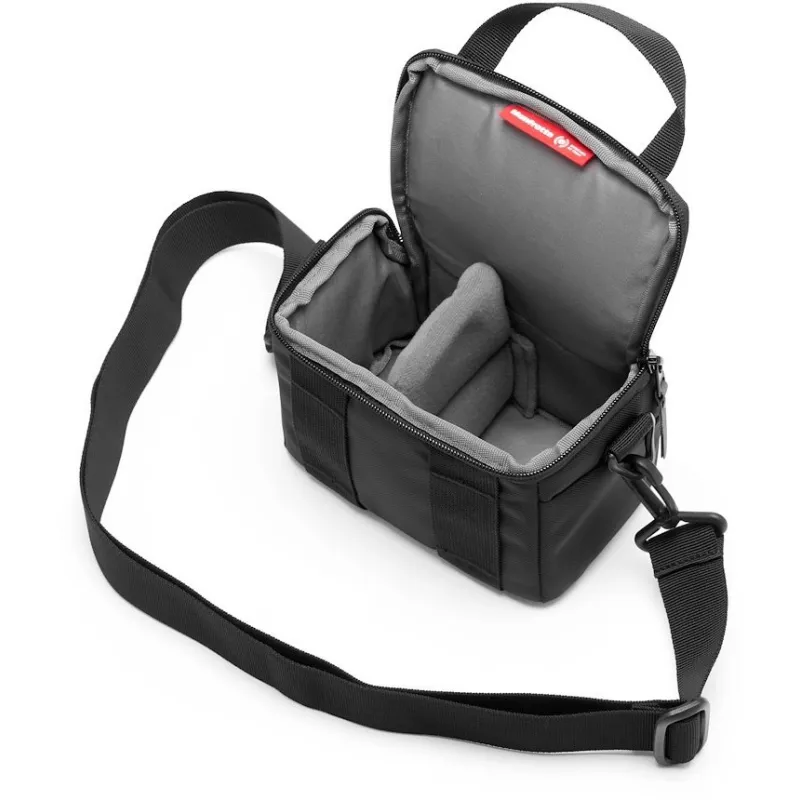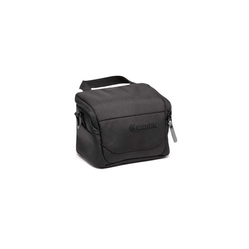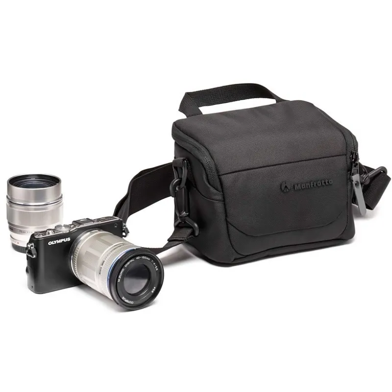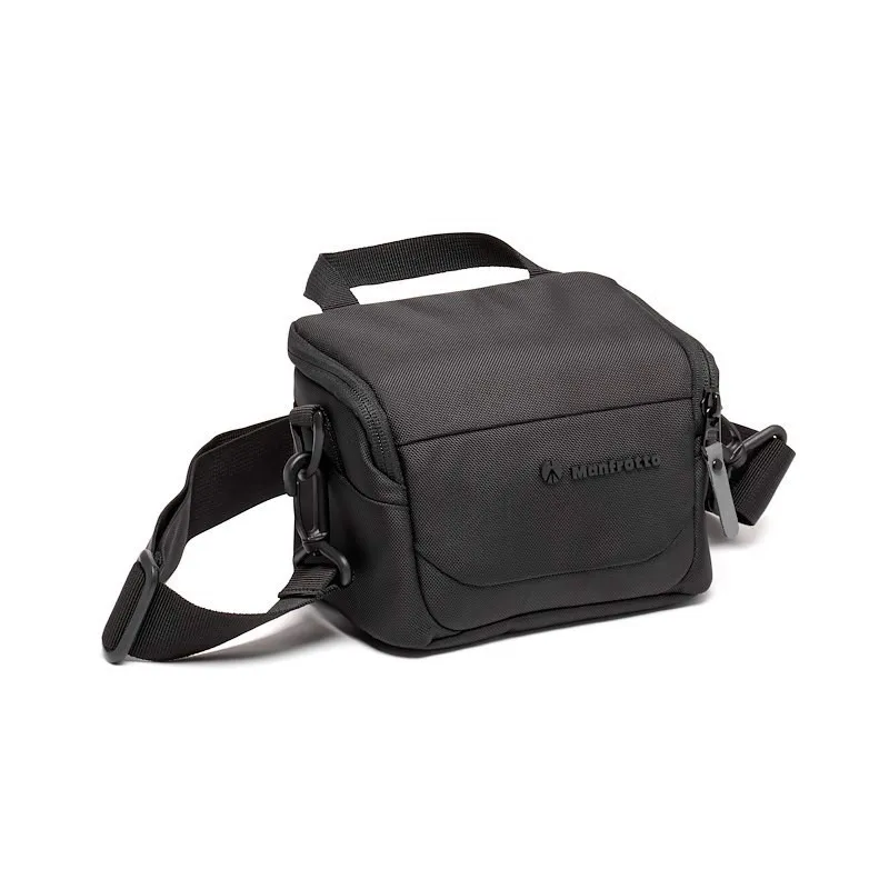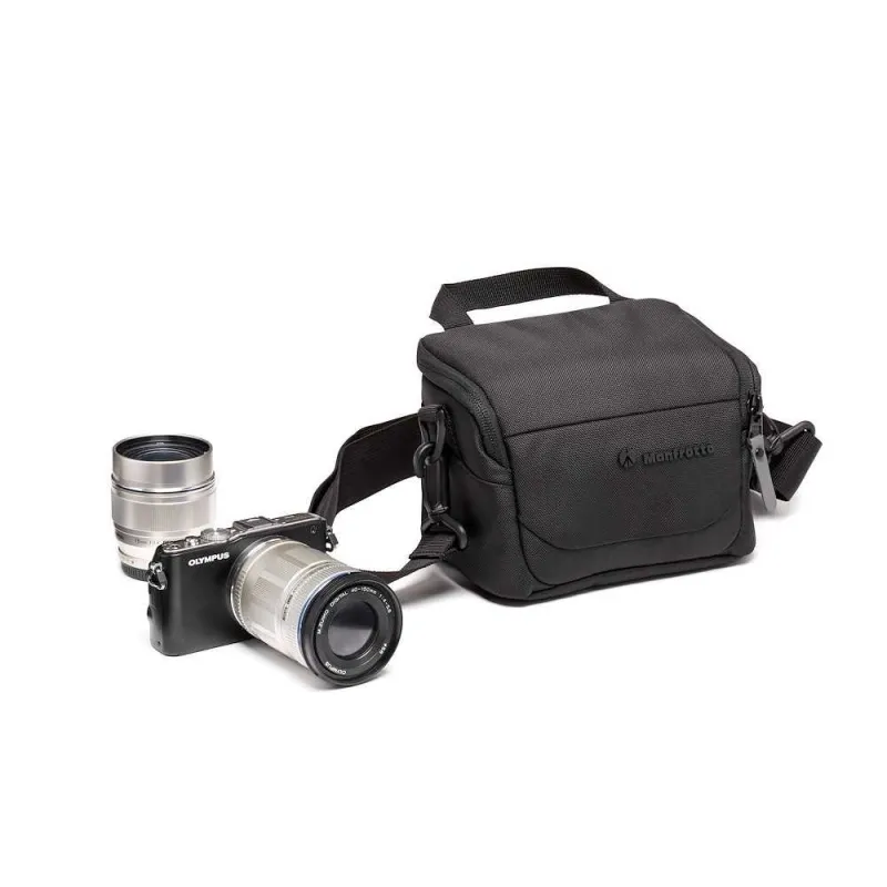 Compact Manfrotto Advanced series camera bag Fits a DSLR with a kit lens Two pockets for small accessories Can be carried in hand, on the shoulder or on a belt Water repellent exterior & raincover
