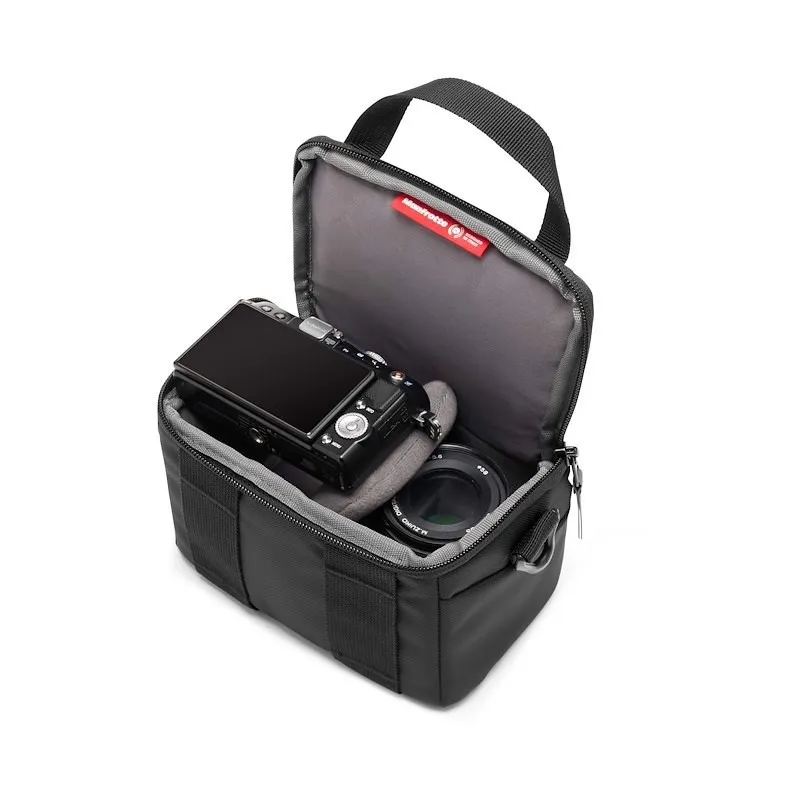 Compact shoulder bag Fits a mirrorless camera or a small DSLR Soft padding protects from bumps Extra pockets for accessories Waterproof exterior