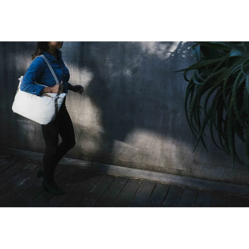 While its padded, removable shoulder strap allows this bag to be worn along or across the body, the Everyday Tote Bag v2 can also be shouldered or hand-carried using its built-in handles. When traveling with a rolling case that has a telescoping handle, the carry handles also function as a pass-through band, allowing the entire bag to be mounted onto such handles for added convenience.