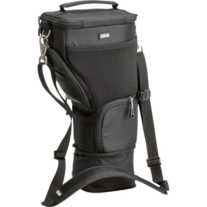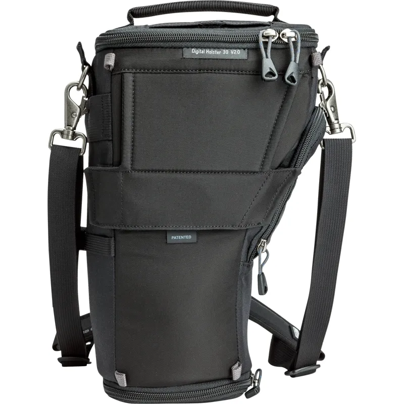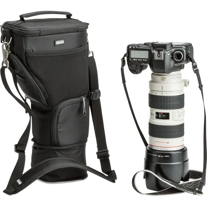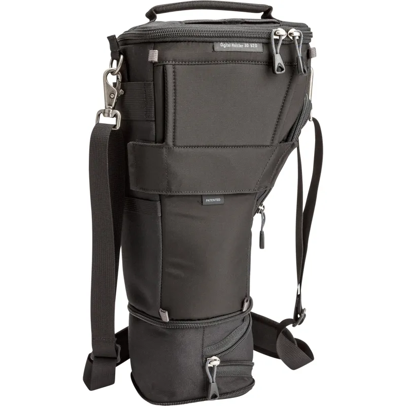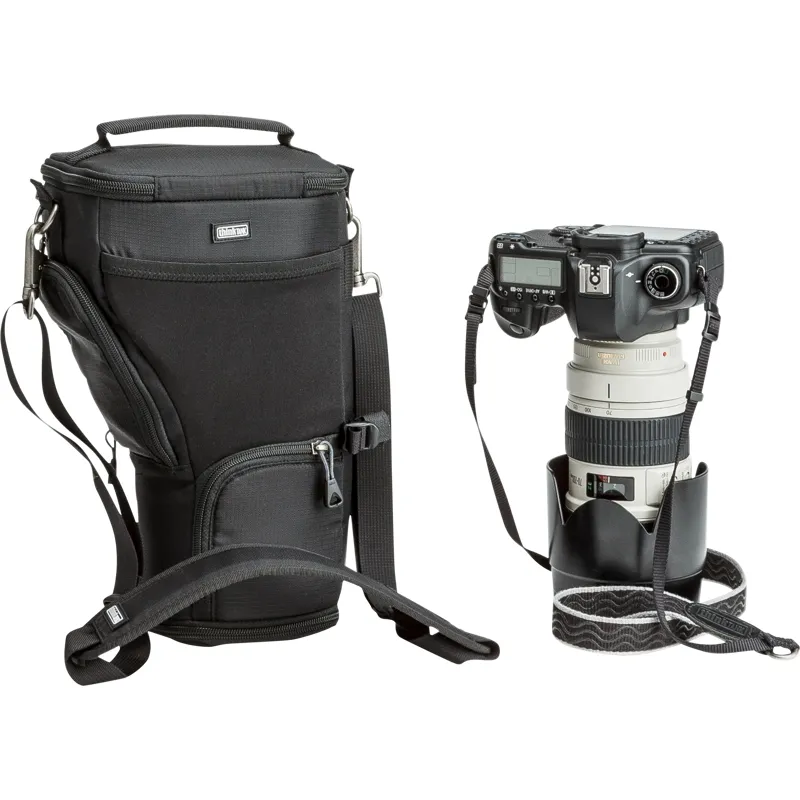 Unique holster developed for a regular size DSLR with a 70-200mm f/2.8 and lens hood in shooting position