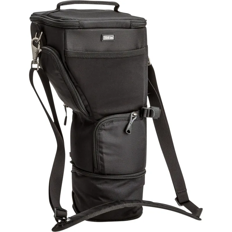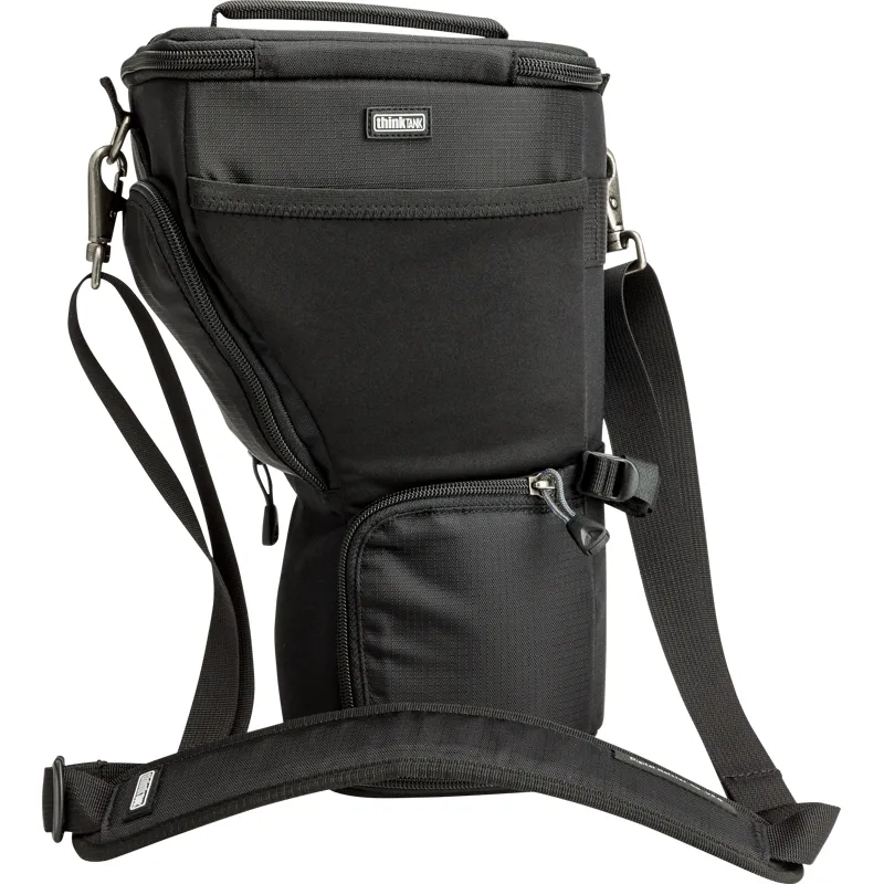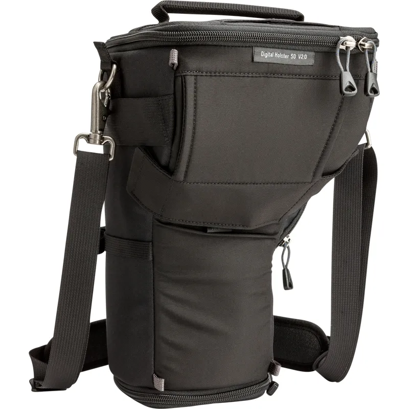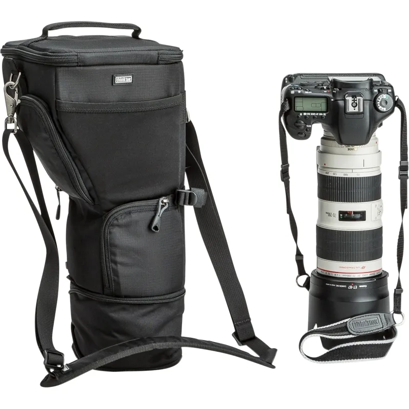 Unique holster developed for gripped DSLR, 70-200mm f/2.8 with lens hood in shooting position