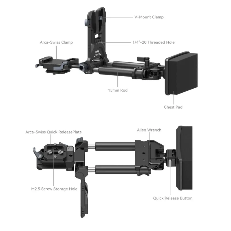 The L shaped design integrates the quick release plate for Arca Swiss, V mount battery plate, stretchable rod and 1/4 20 threads for quick installation and adjustment of camera and battery. Through the 1/4 20 threads connected to the dual 15mm rods and quick release chest/belly support system to reduce load and ensure more stable handheld shooting.