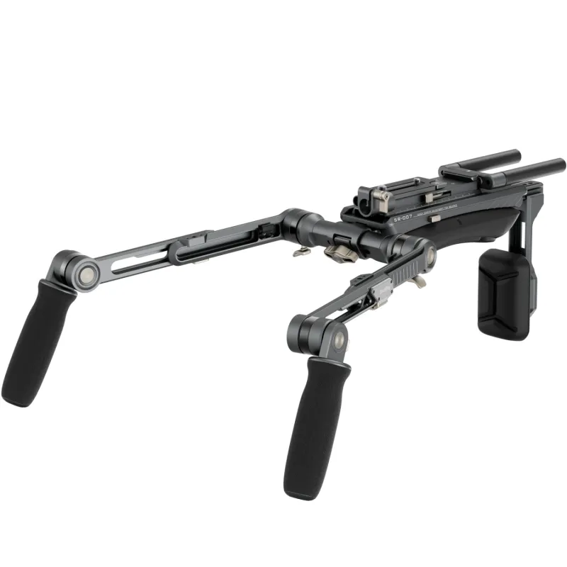 The rig features ergonomic handles for a comfortable grip and 360-degree rotation. The extension arms can be adjusted horizontally for better control, while the streamlined shoulder and back pads provide exceptional support. The back pad adjusts up to 90 degrees for a snug fit, and the quick-release plate allows for swift balance adjustments.