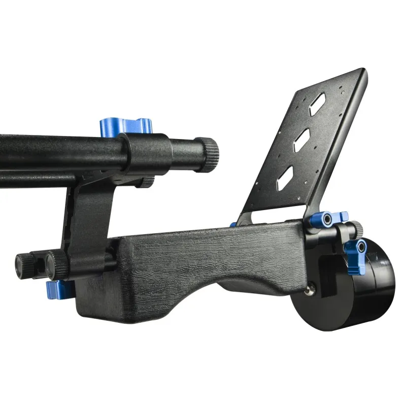 The Rig can be adjusted exactly to your requirements. For example, you can mount a follow focus system or barn doors on the rig and that way optimize the rig precisely for yourself and your work. Due to the Z-bracket, you have various options of assembling the rig and that way have the option of mounting the camera on the right or left of the shoulder rest. The camera plate can be adjusted in height and length and therefore be adjusted perfectly to the position and the center of balance of the camera-lens combination. With the 1/4 and 3/8 inch threads on the bottom of the rig, it can also be mounted on a tripod. Due to the quick-release fasteners, the rig is quickly assembled and disassembled. It can be stored in a space-saving manner.