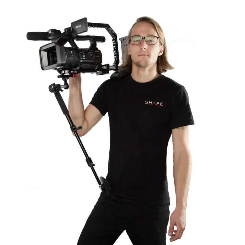 Mount your camcorder or small/midsize ENG-style camera onto your shoulder for handheld shots with this Shoulder Rig Bundle from SHAPE. The rig features an ENG-style baseplate with a 15mm rod clamp, the Paparazzi top handle, a multipurpose cheese plate, a composite mini shoulder pad, a back pad, and two 15mm rods that measure 10" in length.