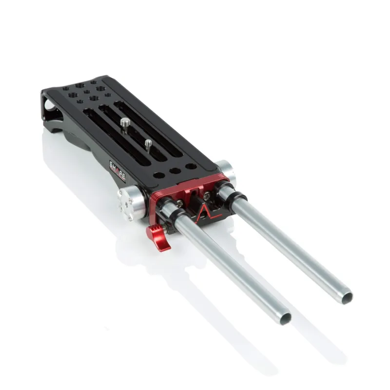 The aluminum baseplate features 1/4"-20 and 3/8"-16 camera screws to mount your camera, 1/4"-20 and 3/8"-16 accessory mounting threads for a variety of accessories, and 1/4"-20 and 3/8"-16 bottom threads for mounting onto a tripod or rig. The two included 10" 15mm rods mount onto the LWS rod block on the baseplate for additional accessories.