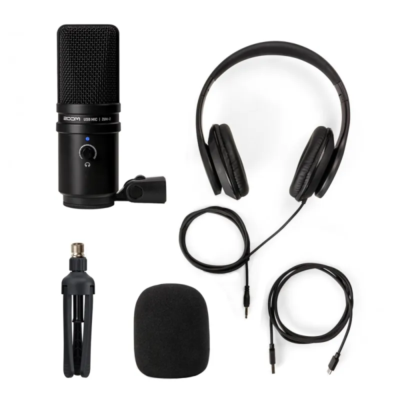 The ZUM-2 Podcast Mic Pack includes a broadcast-style USB microphone, professional closed-back headphones, an adjustable tabletop mic stand, a foam windscreen, and a 2-meter USB cable. All you need is your computer.