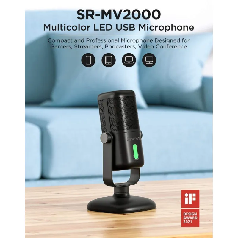 The Saramonic SR-MV2000 USB-connected condenser microphone is a device that was created for podcasting, conferences, interviews, game streams or live broadcasts. It will prove itself wherever you need to be heard loud and clear, while maintaining the highest quality of recorded or transmitted sound. Put your best foot forward in Skype and Zoom meetings and forget about hum, crackle and noise. Make professional broadcasts at home and capture all your new song ideas without wasting time setting up equipment. Quickly and conveniently connect the microphone to your computer, tablet or smartphone with USB or USB-C port. An easy-to-read multicolored LED indicator shows you the operating mode, and you can configure the necessary settings using the ergonomic knobs with built-in buttons. The microphone also features an amplifier so you can connect headphones for real-time recording control. You can easily install it on the included desk stand or screw it to a professional tripod. Thanks to the convenient 360° angle adjustment of the microphone, you can perfectly adjust the device to your needs. The Saramonic SR-MTV500 microphone is all you need to prove yourself as a podcaster and create professional broadcasts on important topics you want to share with the world! Main features of the Saramonic SR-MV2000 condenser microphone with USB connector for podcasting cardioid microphone professional recording quality widely applicable possibility to install on a professional tripod with 5/8" thread multi-coloured LED indicator for mode indication Adjustable 360° microphone angle built-in headphone amplifier real-time monitoring of recordings quick mute button Learn the power of a cardioid microphone The Saramonic SR-MV2000 condenser microphone with USB connector for podcasting guarantees professional recordings that you can quickly and conveniently save to your smartphone, tablet or computer. It is the ideal choice whether you are recording alone, or for interviews or broadcasts with a larger group. This unique cardioid microphone will allow you to record crystal clear sound coming straight to the device, while eliminating unwanted background noise. Convenient operation When using the Saramonic SR-MV2000 microphone, you don't have to reach for a mixer to set the optimal listening volume or adjust the signal gain ("gain") to suit your needs. The housing features ergonomic knobs, with built-in buttons that allow you to conveniently set recording parameters. Thanks to the easy-to-read LED indicator, a glance is all it takes to see which settings the microphone is currently using. Exclusive design If you watch game streams, vlogs, broadcasts made by youtubers or podcasts published on YouTube along with video footage, you have surely more than once drawn attention to designer microphones that fit into the composition of the frame. Professional, good-looking equipment is, in a way, the creator's business card! Whether the Saramonic SR-MV2000 condenser microphone appears in your shots on a magnetic stand or telescopic tripod, you can be sure that the matte black and modern design will give them a professional touch. Control recordings in real-time The Saramonic SR-MV2000 microphone features a 3.5mm mini jack socket that will allow you to conveniently connect headphones. Real-time monitoring of recorded speech or vocals will allow you to more easily catch errors, slips, mistakes and unwanted sounds. Give yourself full control over the recorded audio without having to invest in additional equipment. The Saramonic SR-MV2000 microphone and a pair of headphones are enough to catch noises that should not appear in the final recordings! Professional listening with mix Want to produce even more professional broadcasts, podcasts, streams and recording sessions? Take advantage of monitoring in "USB" mode and give yourself a true studio listening experience. With the "Play Back" feature, you can hear your recorded voice along with additional tracks such as music, sound effects, or audio from the game you're streaming. This allows you to hear what the final version of your material will sound like, so you can prepare it even better. Turn your smartphone into a professional studio Included with the Saramonic SR-MV200 condenser microphone is a USB-C / USB-C cable that will allow you to quickly and conveniently connect the device to a smartphone or tablet equipped with the appropriate port. This way, you don't have to worry about computer access when you're doing an interview, podcast or broadcast recording in the field. All you need is a mobile device with a USB-C port and an audio recording app to quickly and conveniently record your conversation, speech or ambient sounds anywhere. Magnetic stand Thanks to the ergonomic design of the stand, the Saramonic SR-MV2000 microphone will always remain in place, ensuring comfortable recording, whether alone or during sessions with invited guests. The 360° angle adjustment allows you to optimally match the device to the conditions in which you are recording. Strong magnets will also ensure its stable and optimal positioning. And if your recordings require you to install the microphone on a tripod, the stand can be detached in a second, without wasting time on unscrewing it. Plug it in and record Out of the box, you just need a few seconds to plug the microphone into your smartphone, tablet or computer and start recording. With this simple plug-and-play solution, you don't need the help of professionals to ensure crystal-clear audio quality while videoconferencing, recording podcasts, making your own broadcasts or streaming online games. Convenient tripod mounting The space you're recording in requires the use of telescoping tripods, making it easy to position your microphones for optimal performance? Or are you looking for a way to expand the capabilities of your home studio? The Saramonic SR-MV2000 microphone comes with a special adapter that will allow you to professionally mount