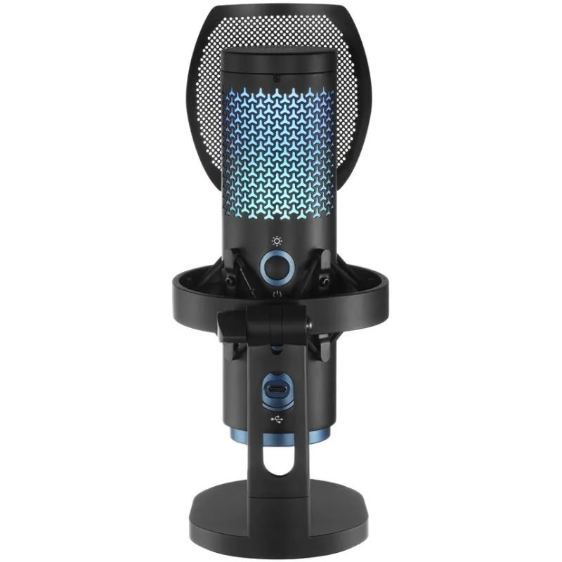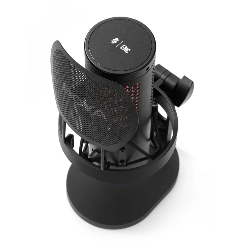 Includes a shock mount to reduce vibrations and a pop filter for clear audio, with a DSP chip for noise cancellation activated by touch.