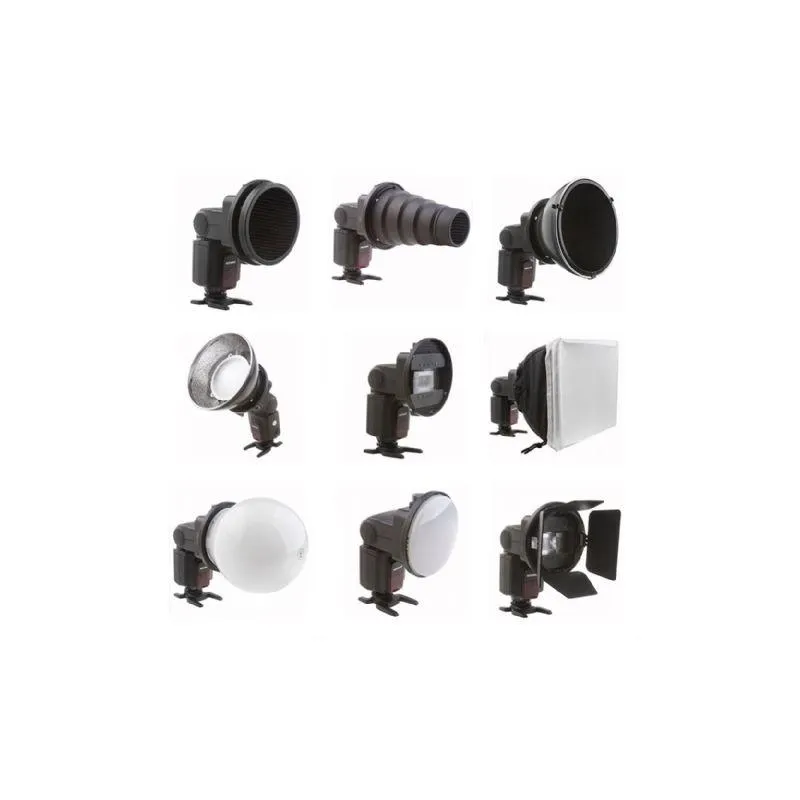 ;The softbox, diffuse sphere and reflector can be used to evenly spread the light emitted from your speedlite, while the honeycomb grid, conical snoot and barndoor set can be used to direct and focus the light upon a subject you wish to photograph.